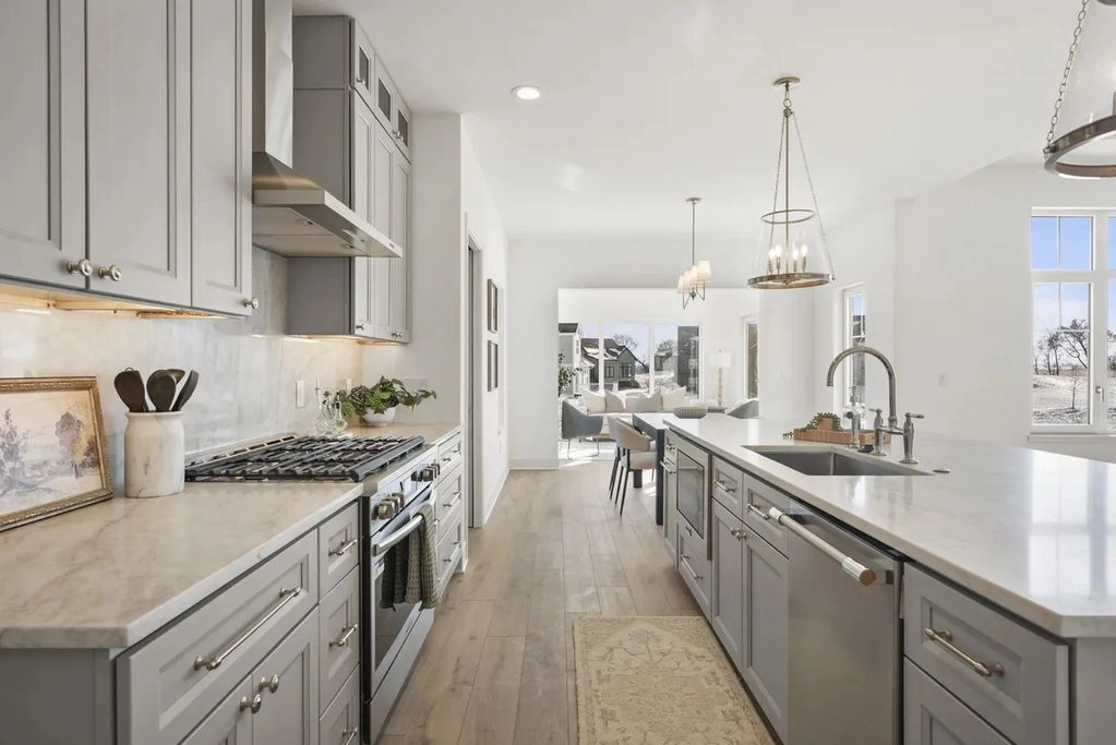 This elegant kitchen features stunning Calacatta Lapiza quartz countertops, beautifully crafted with a 2" mitered edge and a waterfall design that flows seamlessly to the floor.